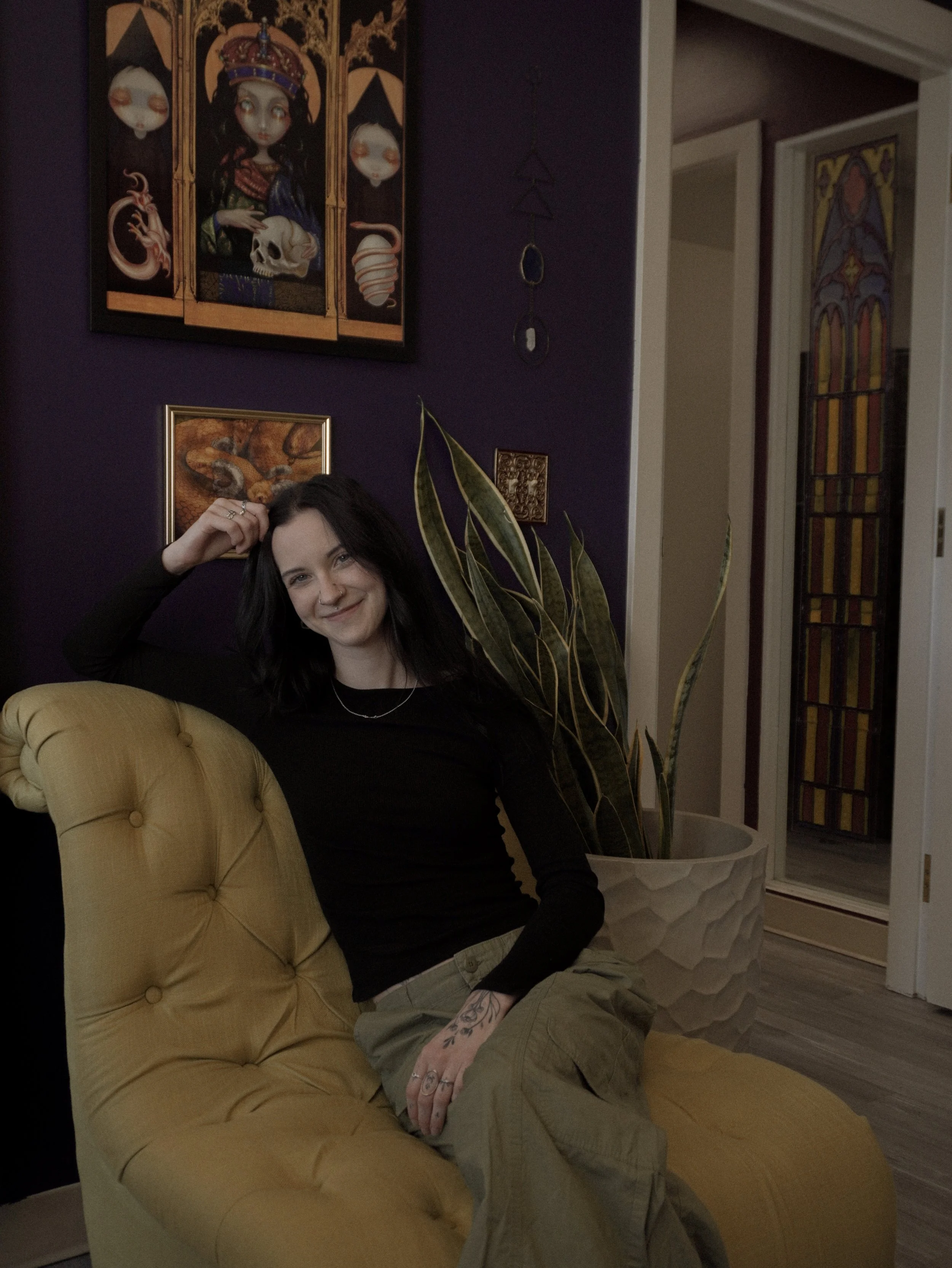 Jada has been in the piercing industry since 2021 working front desk at various shops around the Seattle area until she began her apprenticeship in the middle of 2025! She moved to Reliquary from Skin and Soul to continue training under mentor Ren. She is currently offering select piercings for an apprentice rate and would be ecstatic to pierce you! When she isn’t busy being a jewelry gremlin, she loves music, dive bars, and cuddles with her cat Bonk.